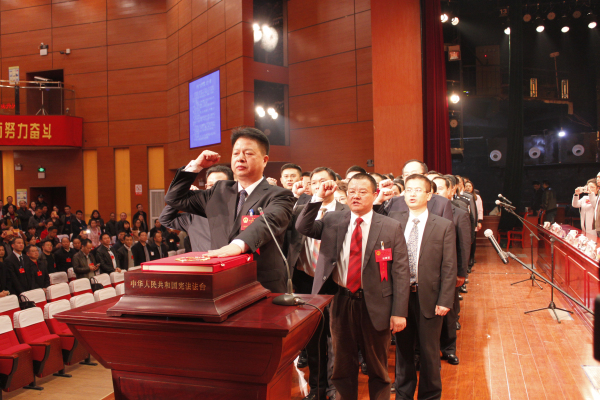 面向国徽,领誓人彭家果左手抚按红色的《中华人民共和国宪法》,右手举拳,高声诵读誓词。“我宣誓:忠于中华人民共和国宪法,维护宪法权威,履行法定职责,忠于祖国、忠于人民,恪尽职守、廉洁奉公,接受人民监督,为建设富强、民主、文明、和谐的社会主义国家努力奋斗!” 宣誓人刘健、孙鹏伟等56名新当选的人员在领誓人身后依次站立,右手举拳,神情庄重,齐声跟读誓词。